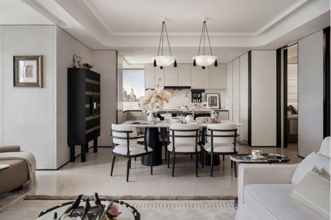 厨房的巨量收纳系统,超大尺度的中西岛台,既符合中式烹饪的实用逻辑,预留足够操作台面,又能承载西式社交,还有新颖的转角蝶形收纳——