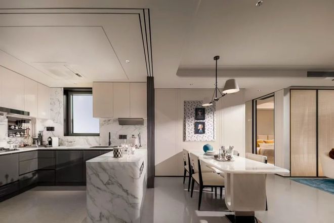 厨房、餐厅、客厅与阳台相连通,形成联动空间,尺度感阔绰。很好地满足二胎家庭多样化的活动需求。